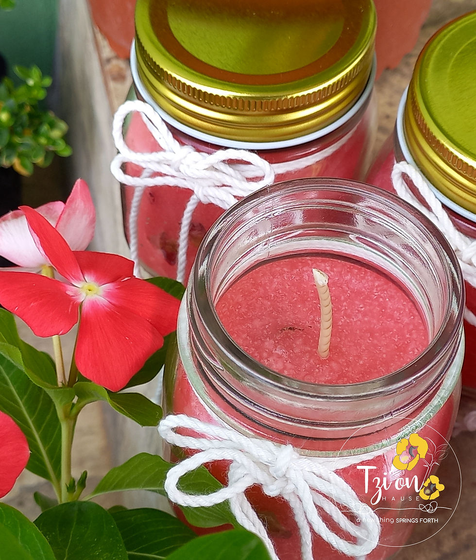 Indoor and outdoor air-refreshening candles of varied fragrances including essential oils. These are packaged in used cans for outdoors and glass containers for indoors.